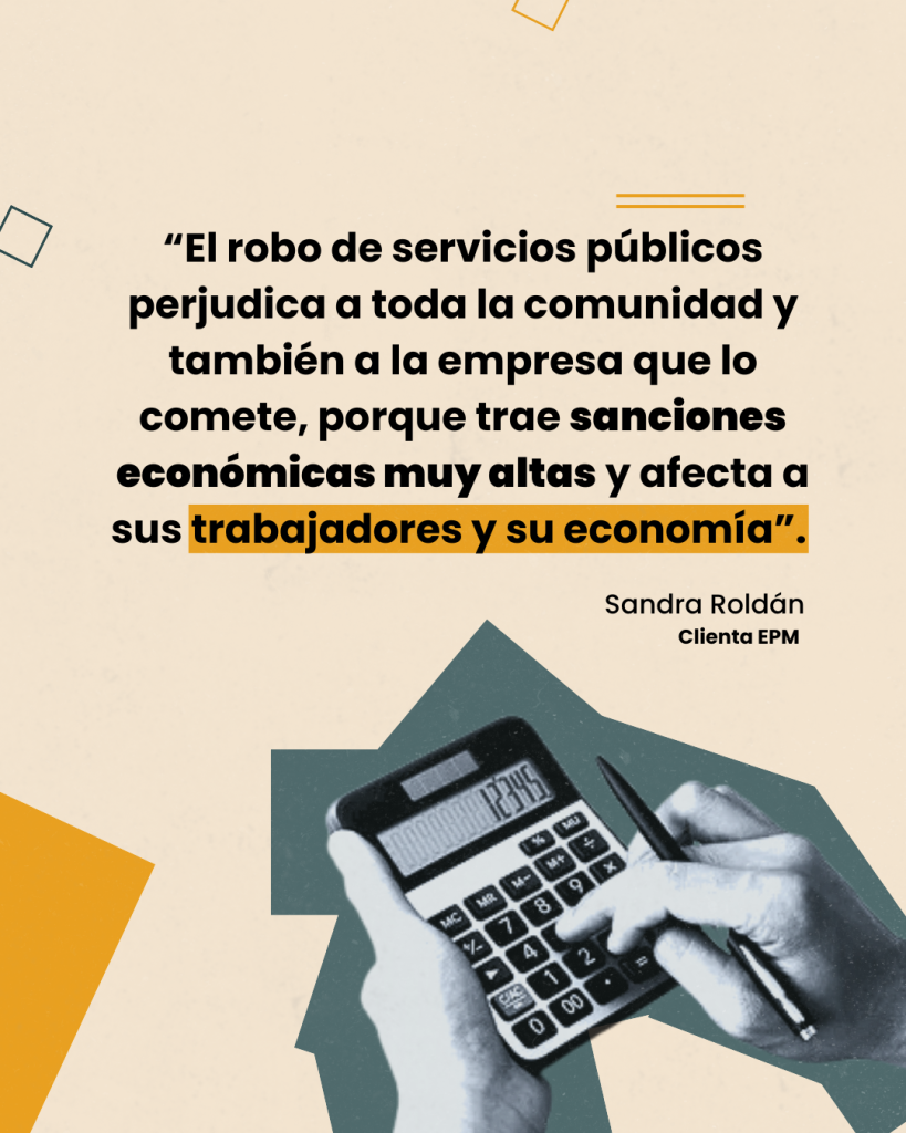 El robo de servicios públicos perjudica a toda la comunidad y también a la empresa que lo comete, porque trae sanciones económicas muy altas y afecta a sus trabajadores y su economía”, señala Sandra Roldán, clienta de EPM.